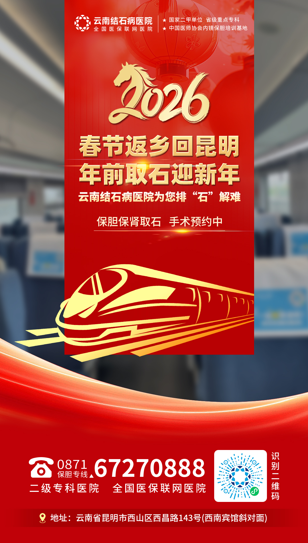 春节是团圆和欢乐的时刻,我们更应该关注身体健康。有个健康的身体,才能更好地陪伴亲友、享受美食、放松身心,云南结石病医院在此呼吁广大结石病友,年前取净结石,安心、平安地度过一个快乐、祥和的春节!提前祝大家春节快乐,身体健康!