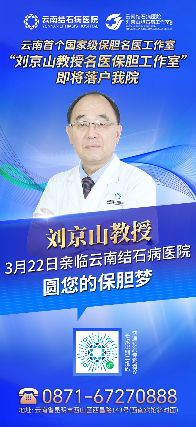 3月22日,云南首个国家级保胆名医工作室——“刘京山教授名医保胆工作室”将在云南结石病医院正式落户。